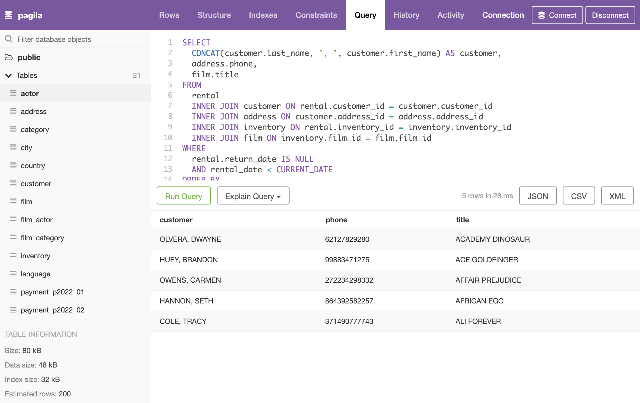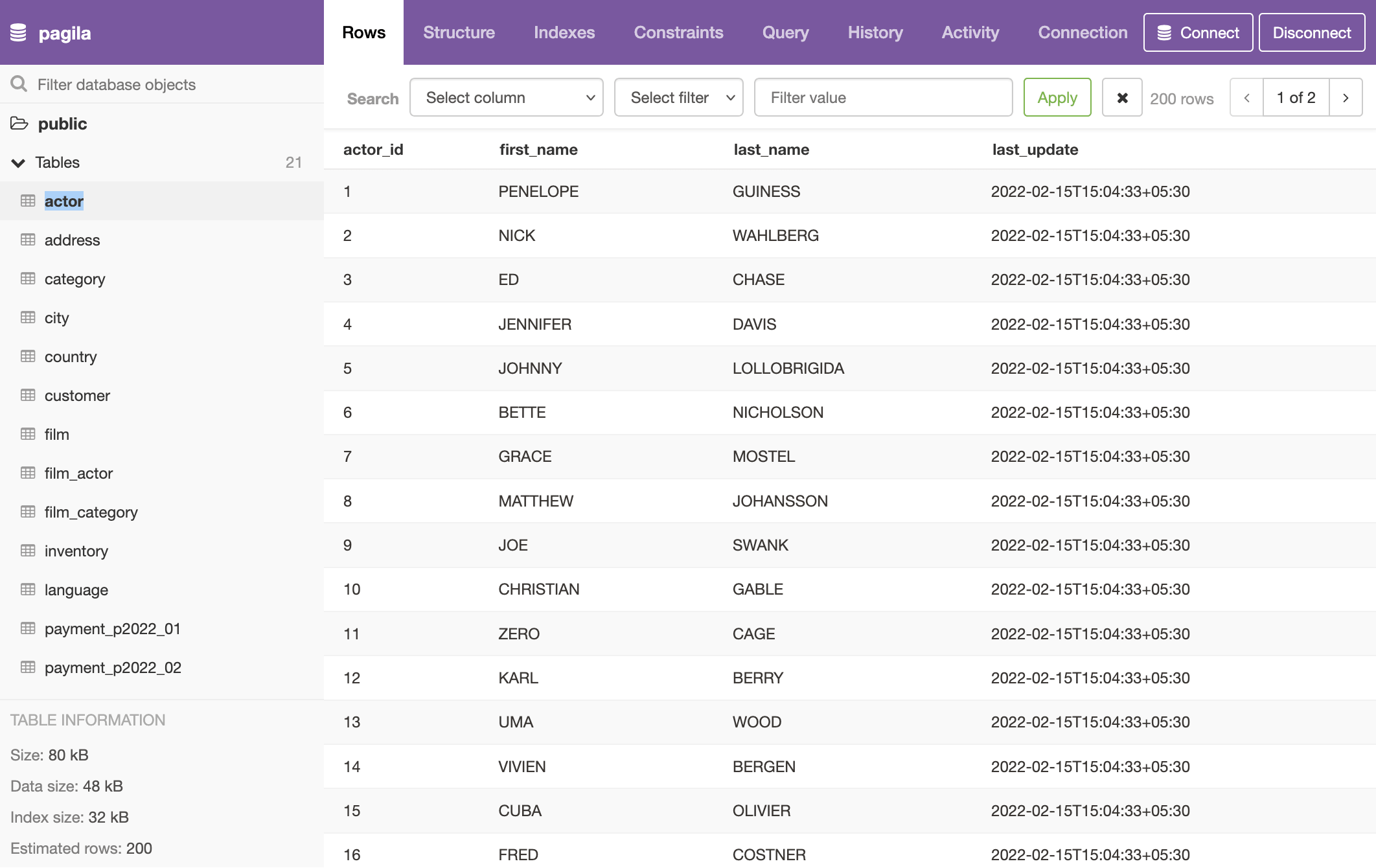 After entering the credentials, you can browse your database tables, views, functions and other objects. You can also see the indexes and constraints of a table, list out the rows and so on: